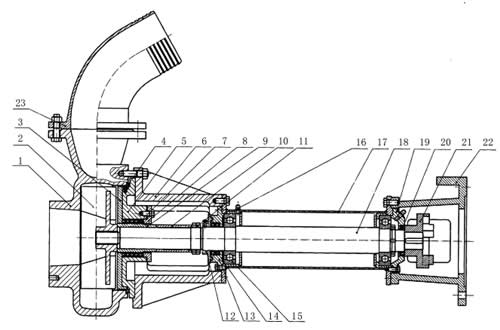 1、泵體 2、葉輪 3、泵蓋護(hù)板4、泵體膠墊 5、泵蓋 6、泵座7、油封 8、油封壓蓋 9、軸套 10、定位套 11、調(diào)整螺母 12、封塵端蓋 13、泵聯(lián)器 14、油封 15、軸承(6313) 16、注油杯 17、中段 18、軸 19、上軸承壓蓋 20、油封 21、泵聯(lián)器 22、電機(jī)支架 23、出水彎管