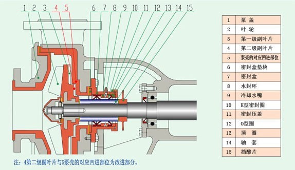 UHB-ZK-AB型耐腐耐磨泵是對(duì)UHB-ZK-A系列泵的改進(jìn)型泵(見上圖)。兩者之間的區(qū)別在于后者是無(wú)臺(tái)階式背葉片,前者為臺(tái)階式背葉片結(jié)構(gòu)(見圖中序號(hào)4)。改進(jìn)后的葉輪的背葉分為二級(jí),二級(jí)背葉片之間有凸起臺(tái)階。與之相匹配的泵也有凹進(jìn)的臺(tái)階。設(shè)置背葉輪臺(tái)階的目的是阻斷泵出口流體壓力對(duì)軸密封的返流壓力,保證和延長(zhǎng)軸密封的使用壽命。