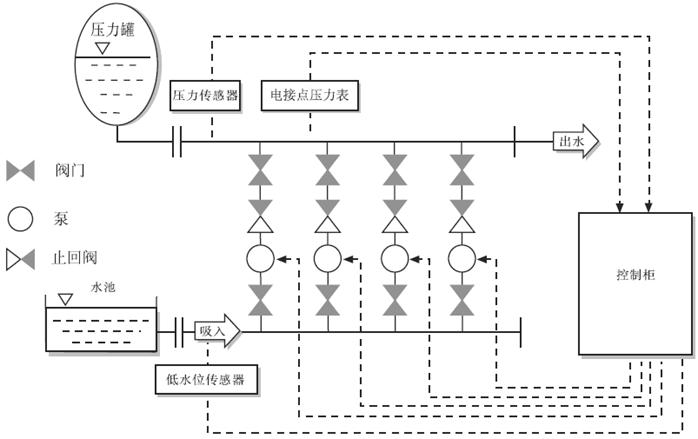 當管網(wǎng)壓力大于啟動壓力時設(shè)定值時由與出水管路連接的壓力罐供水,如果管網(wǎng)壓力等于啟動壓力設(shè)定值時啟動水泵,水泵運行中管網(wǎng)壓力達到停止壓力時停止水泵運行,水泵啟動后管網(wǎng)壓力超過啟動壓力,未達到停止壓力時水泵繼續(xù)運行;水泵全速運行后管網(wǎng)壓力未達到啟動壓力時水泵追加啟動。