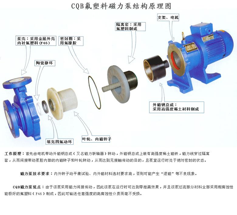 CQB磁力泵結(jié)構(gòu)緊湊,外型美觀,體積小,躁聲低,運行可靠,使用維修方便產(chǎn)品廣泛適用于:化工、制酸、制堿、冶煉、稀土、農(nóng)藥、染料、醫(yī)藥、造紙、電鍍、酸洗、無線電、科研機構(gòu)、國防工業(yè)等單位抽送酸,堿液,油類稀有貴重液,毒液,揮發(fā)性液體。特別是易漏,易燃,易爆液體的抽送。選用配套防爆電機則更為理想。