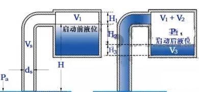 泵啟動后,液面下降,達到穩(wěn)定運行工作后,罐內(nèi)應(yīng)存有一定體積量V3的水,而氣體之外的罐內(nèi)空氣體積為V1+V2。罐內(nèi)部的壓力為P1,壓力小于外界大氣壓力Pa。