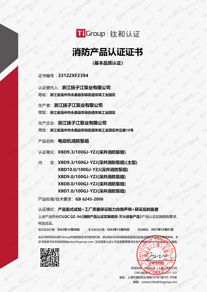 日前,浙江揚子江泵業(yè)順利通過消防泵柴油機消防泵穩(wěn)壓成套及控制柜消防電氣控制裝置消防產品認證.