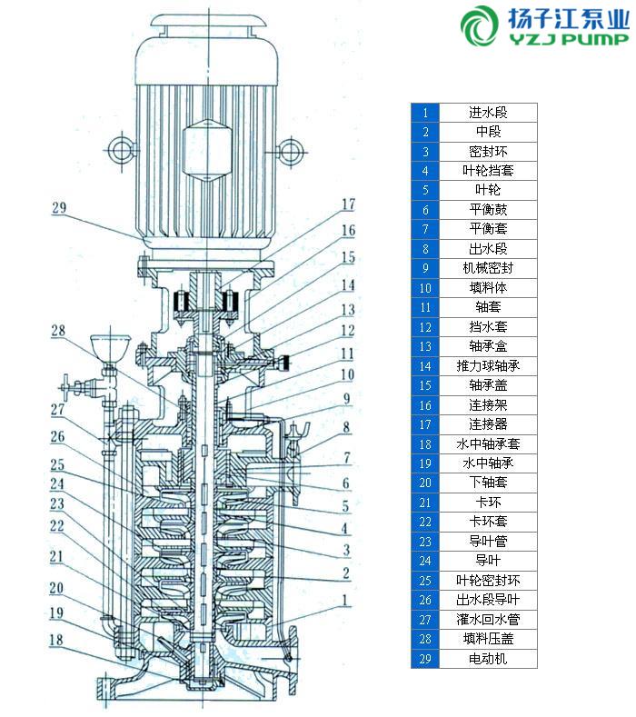 DL型泵由電機(jī)和泵兩部分組成,電機(jī)為丫型三相導(dǎo)步電機(jī),泵和電機(jī)采用聯(lián)軸器連接.整體為剛性連接,使用吋無需校正泵由定子部分利轉(zhuǎn)子部分組成泵定子部分由進(jìn)水段.中段.導(dǎo)葉.出水段、填料函體等零件組成為防止定子磨損,定子上裝有密封環(huán).平衡等,磨損后可用備件更換轉(zhuǎn)子部分由軸.中輪,平衡鼓等組成轉(zhuǎn)子下端為水潤滑軸承.上部為角接觸球軸承.泵的軸向力絕大部分由平衡鼓來承擔(dān),其余小部分殘余軸向力由角接觸球軸承來承受逬水段、中段和出水跺的結(jié)臺(tái)面用紙墊通過拉緊達(dá)到密封.軸封采用填料或機(jī)械密封.用戶可根據(jù)需要選擇。