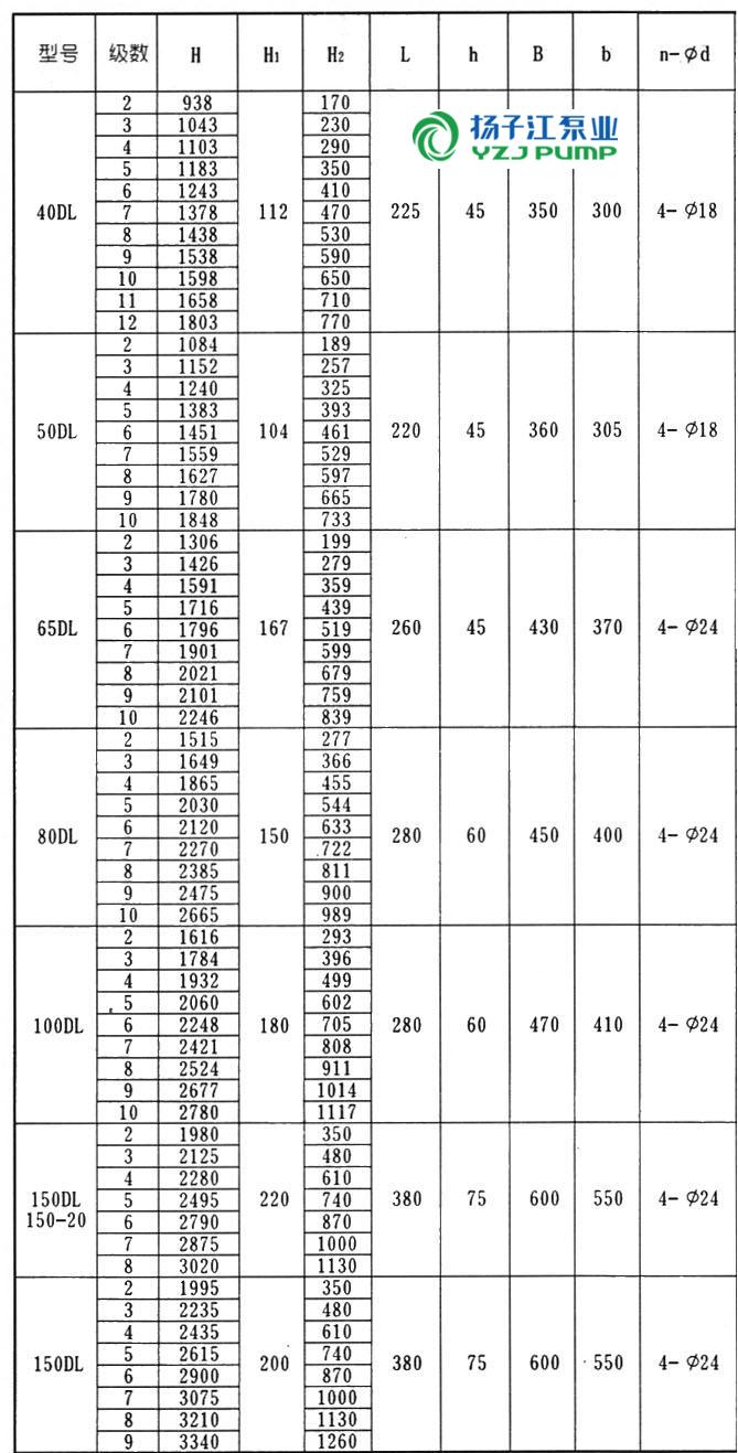 DL系列立式多級(jí)離心泵安裝尺寸表: