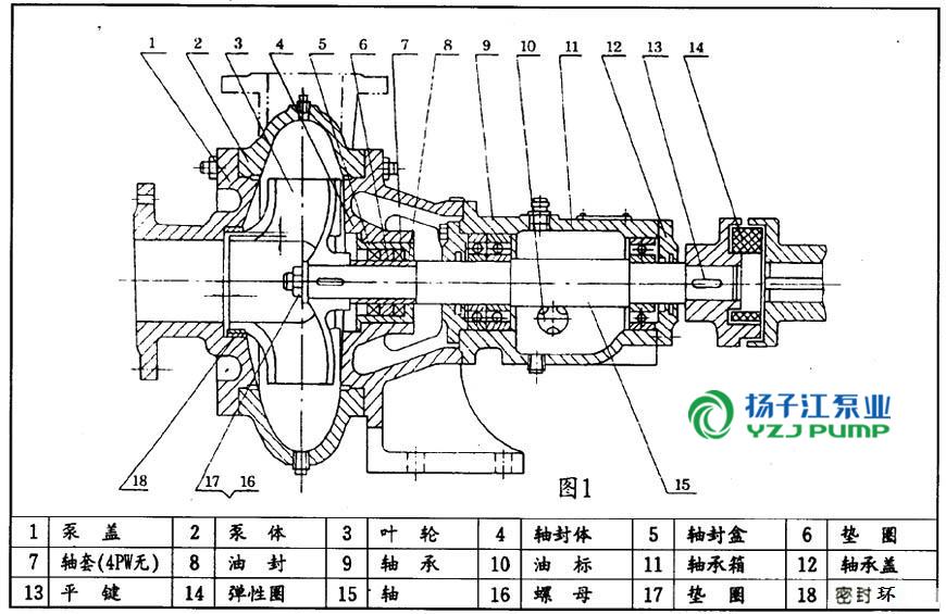 本型泵主要由:泵蓋(1),泵體(2),葉輪(3),軸(15),軸封體(4),軸承箱(11))及聯(lián)軸器部件等組成〈見(jiàn)圖1:結(jié)構(gòu)圖〉