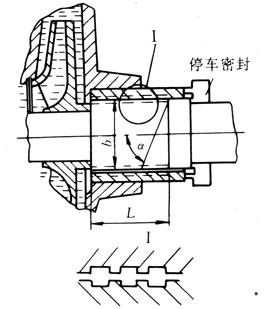 與螺旋密封不同之處是軸套加工成螺紋,且與軸的螺紋旋向相反。當軸旋轉(zhuǎn)時,液體在螺旋間增加紊流摩擦,從而提高了密封能力。密封效果比螺旋密封好