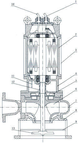 結(jié)構(gòu)特點(diǎn)說明 1、采用獨(dú)特的雙流道無堵塞葉輪結(jié)構(gòu),提高污水污物的過流能力和排污能力。 2、自動(dòng)攪拌裝置,產(chǎn)生極強(qiáng)的攪拌力,將池內(nèi)的沉淀物攪拌成懸浮物后吸入葉輪排出,達(dá)到清淤的作用。 3、隔板將底座一分為二,攪拌與進(jìn)水互不影響。 4、機(jī)械密封為雙端面機(jī)械密封,長(zhǎng)期處于油室中,保證水泵安全可靠地運(yùn)行。 5、副葉輪結(jié)構(gòu)的流體動(dòng)力密封,既有輔助密封作用,從而保護(hù)機(jī)械密封,又平衡軸向力,延長(zhǎng)軸承的使用壽命。 6、泵連線腔內(nèi)沒有漏水檢測(cè)探頭,出現(xiàn)漏水時(shí),探頭發(fā)出信號(hào),控制系統(tǒng)對(duì)泵實(shí)施保護(hù),本公司可配全自動(dòng)安全保護(hù)控制柜。 7、電機(jī)定子采用B級(jí)和F級(jí)絕緣,內(nèi)設(shè)熱保護(hù)器,當(dāng)電機(jī)過載發(fā)熱,保護(hù)器及時(shí)作出動(dòng)作,對(duì)泵和電機(jī)實(shí)施絕對(duì)的保護(hù)。 8、油室內(nèi)裝有油水探頭,當(dāng)機(jī)械密封損壞后,水進(jìn)入油室,探頭發(fā)出信號(hào)由控制系統(tǒng)對(duì)水泵實(shí)施保護(hù)。 9、JPWQ帶內(nèi)循環(huán)冷卻系統(tǒng),能保證水泵在水池低水位正常工作。