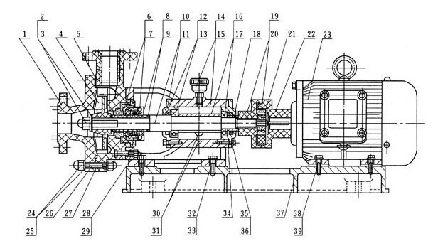 6、如果更換滾珠軸承或泵軸時,必須折下機(jī)架,松開前端軸承蓋4只螺釘,折下泵軸后端園螺母和聯(lián)軸節(jié),將泵軸向前端方向打出即可,再后折下后端軸封蓋。