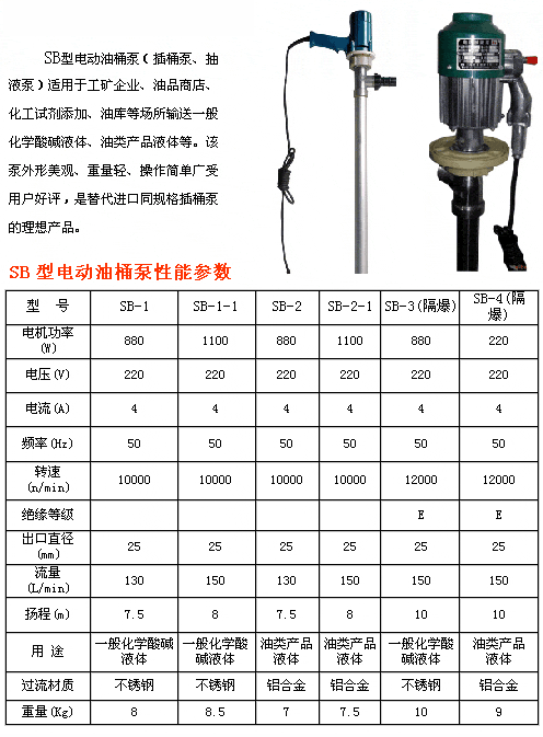 油桶泵(抽液泵)使用于油泵、化工|企業(yè)、商店、航運、農(nóng)村、抽吸不同液體。如在易燃易爆場合使用,可選用本廠生產(chǎn)的防爆型電動抽液泵。使用防爆型電動抽液泵時應(yīng)按CB38361-2<爆炸環(huán)境用防爆電氣設(shè)備>有關(guān)規(guī)定并正確使用防爆插頭插座。本系列產(chǎn)品使用于符合GB/325-1991標準的鋼桶和插入口大于Ф55MM其它容器的液體抽送。