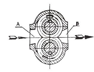 嚙合的齒輪在泵體內(nèi)旋轉(zhuǎn)時(shí),輪齒不斷進(jìn)入和退出跟嚙合。在吸入室,輪齒逐漸退出嚙合狀態(tài),這樣吸入室的容積逐漸增大,壓力降低,液體在液面壓力的作用下進(jìn)入吸入室,隨齒輪齒間進(jìn)入排出室。在排出室,輪齒又逐漸進(jìn)入嚙合狀態(tài),齒輪的齒間逐漸被一齒輪的輪齒占據(jù),排出室的容積減少,排出室內(nèi)液體壓力升高,于是液體從泵的排出口被排出泵外,齒輪邊續(xù)旋轉(zhuǎn),上述過程不斷進(jìn)行,形成連續(xù)的輸油過程。其原理圖見圖一。(在電機(jī)后端看,箭頭所示為泵的出口)