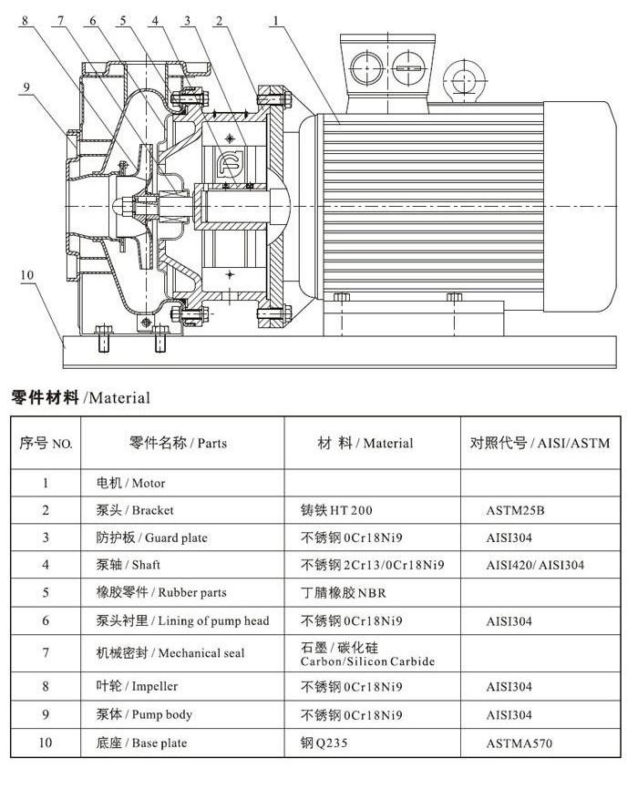 ZS型不銹鋼臥式單級(jí)離心泵為泵軸直聯(lián)型聯(lián)結(jié),由泵、泵軸和標(biāo)準(zhǔn)電機(jī)組成: